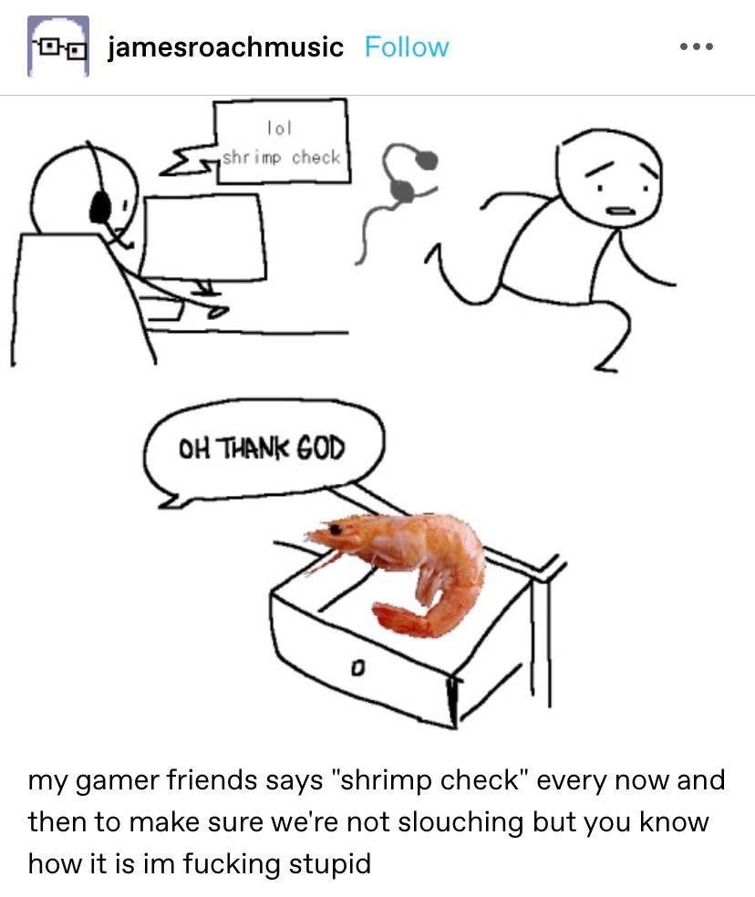 Shrimp Check originated from the a Tumblr post I stumbled upon randomly (hat tip to james roach music on Tumblr). On the face of it, it’s just a funny meme about friends reminding each other to check their [[Posture]][1], but it’s one of those phrases that is so incredibly fun to say I find myself mumbling it to myself under my breath.